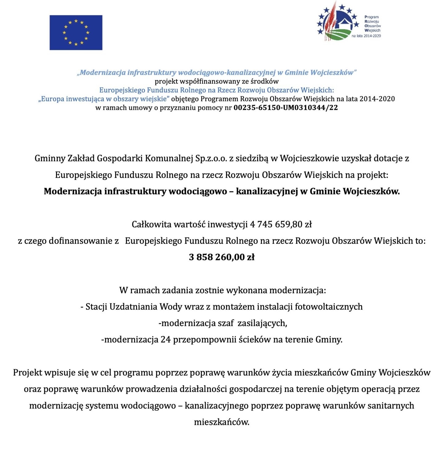 Modernizacja infrastruktury wodociągowo – kanalizacyjnej w Gminie Wojcieszków